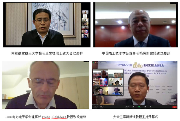 南京航空航天大學校長單忠德院士,中國電工技術學會理事長楊慶新教授,IEEE電力電子學會理事長Frede Blabbjerg教授出席開幕式並致歡迎辭。大會主席、南京航空航天大學阮新波教授主持大會並介紹會議籌備情況。本次會議通過ZOOM會議係統全程在線舉行,並通過目睹直播係統全程直播。